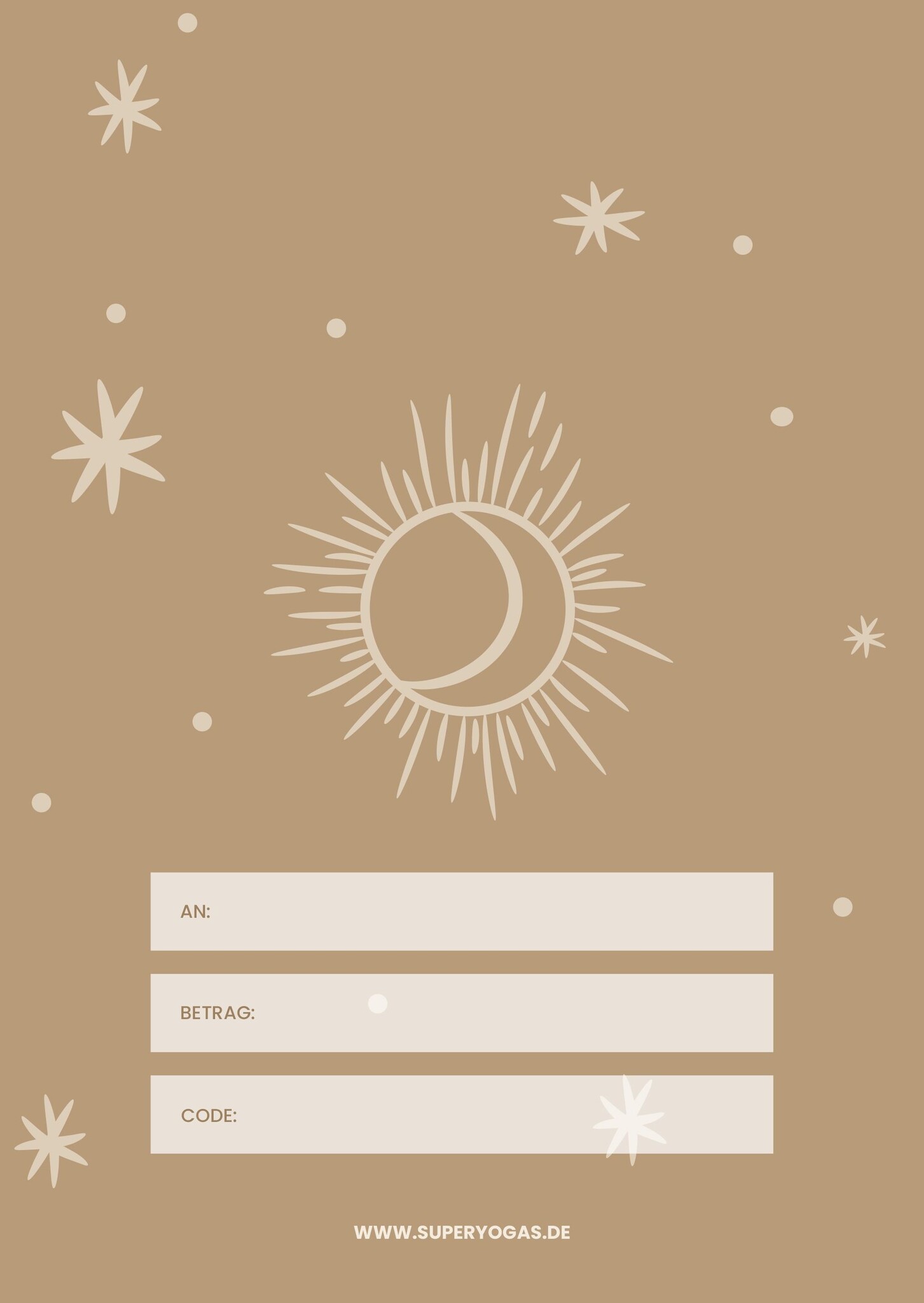 Unmittelbar nachdem Sie den Geschenkgutschein bestellt und bezahlt haben, erhalten Sie eine E-Mail mit dem einmaligen Geschenkgutschein-Code, der auf Superyoga.nl verwendet werden kann. Schreiben Sie diesen Code zusammen mit dem Namen des Empfängers und dem Betrag auf den ausgedruckten Geschenkgutschein und Sie sind bereit, das Geschenk zu überreichen.